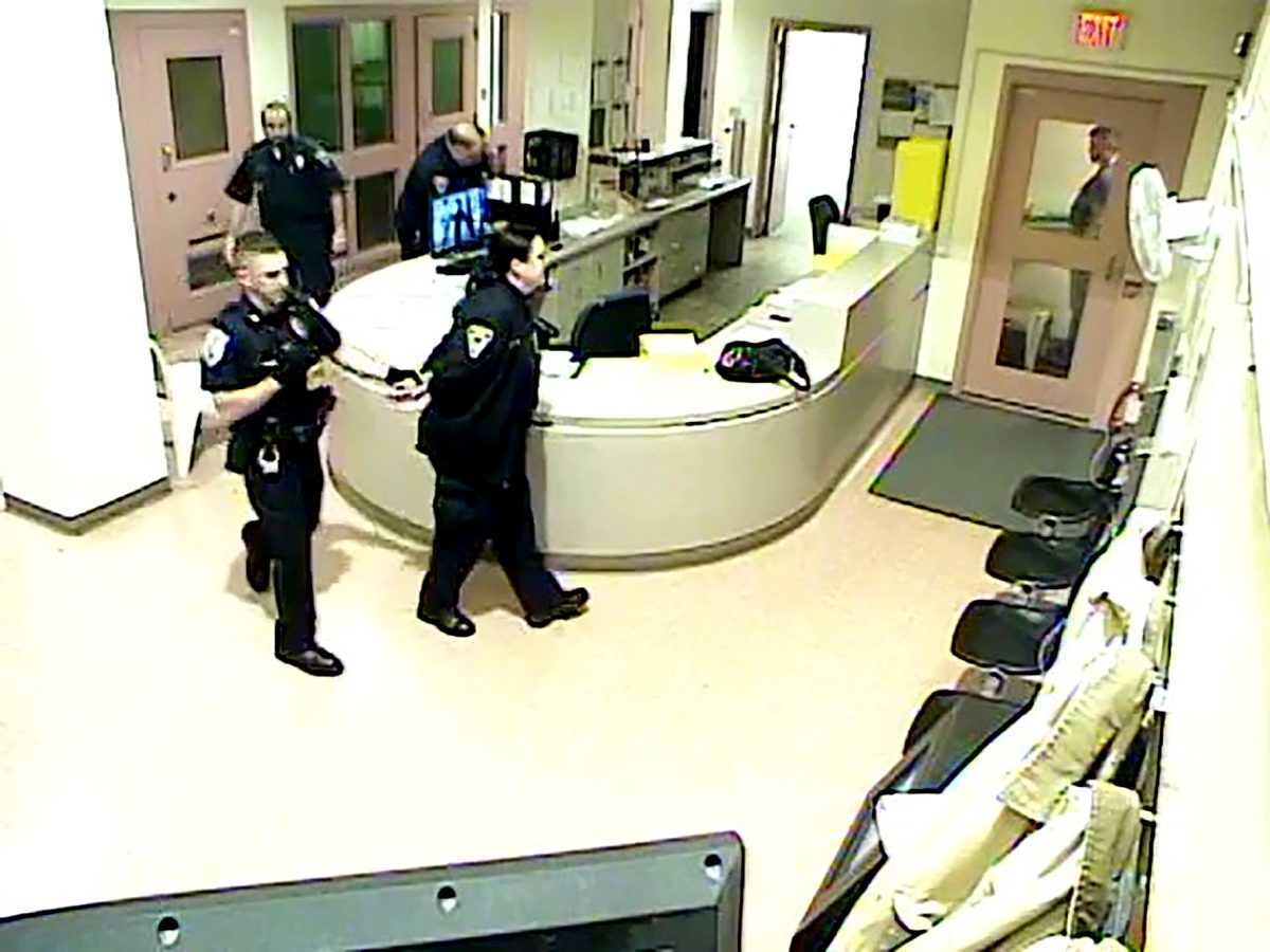 This screen capture from May 27, 2018, surveillance footage released by Washington County shows a Washington police officer, Joseph Moore, restraining the hands of jail Capt. Wendy J. Harris.