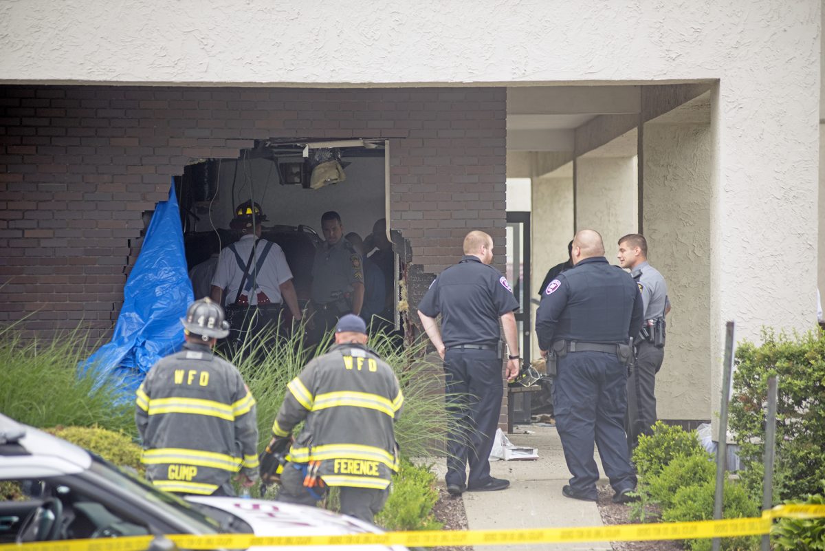Emergency responders work at the scene after a vehicle crashed into a building at Washington Health System’s Neighbor Health Center in June 2018.