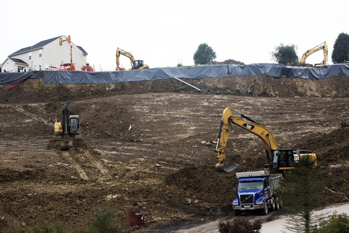 Bulldozers and trucks clear away earth from a hillside at Majestic Hills in North Strabane Township.