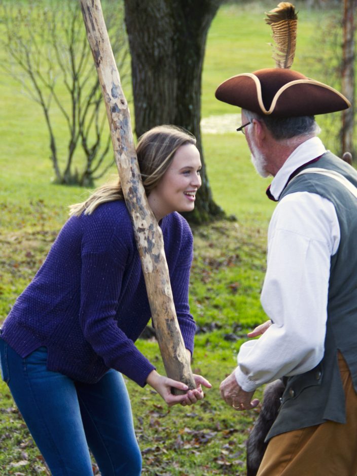 Bethel Park High School student Claudia Huber gives the caber toss a try, with Dale Main providing instruction.