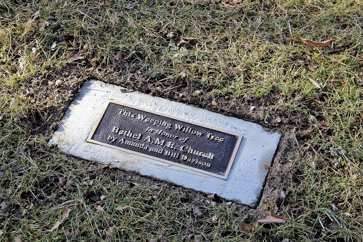 “This weeping willow tree in honor of Bethel A.M.E. Church by Amanda and Bill Davison,” the marker reads.