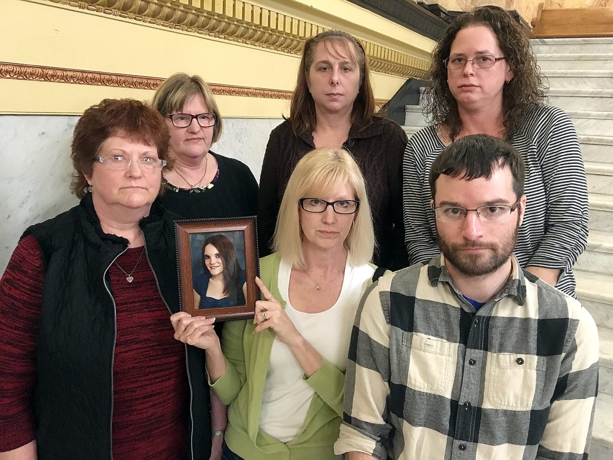 Sarah Wilson’s friends and family, displaying her portrait, traveled from Clearfield County to testify at Friday’s court proceeding for Robert W. Welsh III.