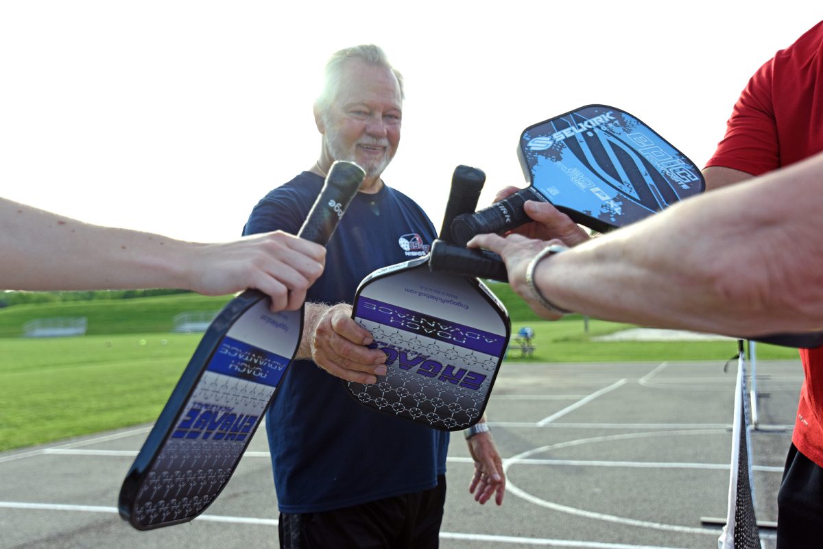 Tom Hincy of South Strabane, an organizer of a pickleball group, taps paddle ends to signify the end of a match with others who played in the mixed-doubles sets.