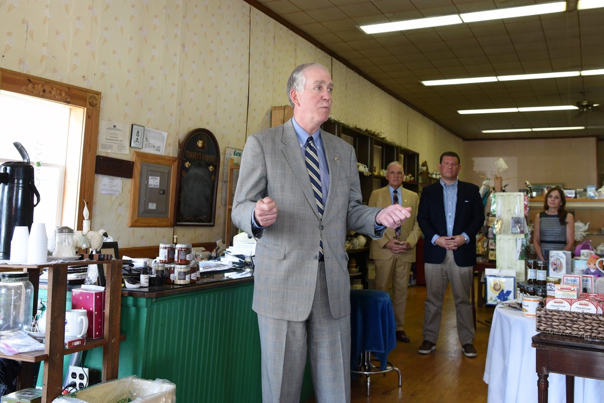 Pat McCune, CB Financial president and chief executive officer, talks about the history of the National Road and Scenery Hill during a grant announcement in May 2018.