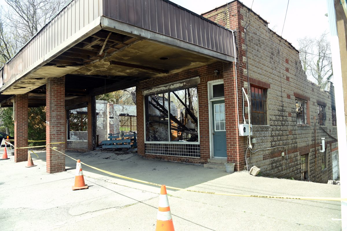 The building, the former Frank Huffman auto dealership and garage, built in 1929, caught fire early in the morning on Christmas Eve. It took four fire companies to bring the fire under control, but the upper level of the building was destroyed. The rubble still sits along Route 40. The property is owned by the Dunker family, who have said they plan to rebuild.