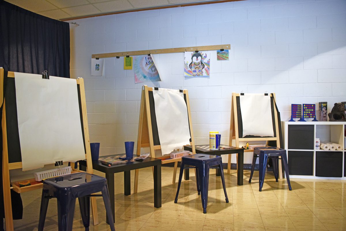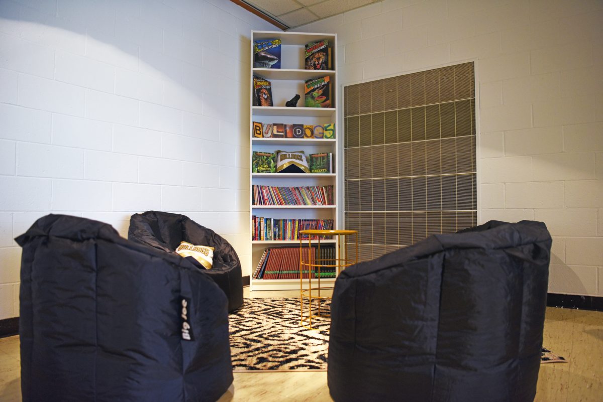 The lounge also includes a reading corner and an art corner. The space was previously used for detentions, which found students facing the wall, and not looking out toward other students in the cafeteria. Many of the items in the lounge came from community donations.