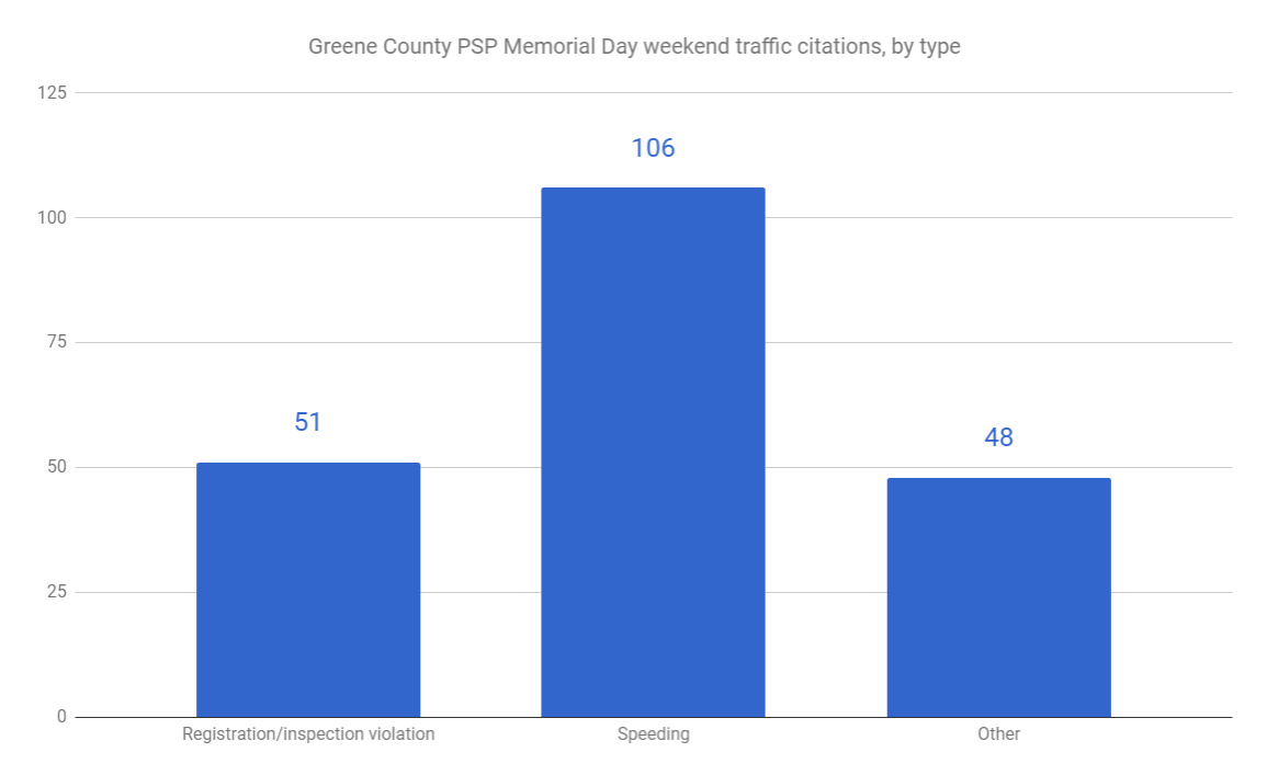Traffic citations issued in Greene County by state police sorted by type over the Memorial Day weekend. These numbers do not include citations from municipal police.