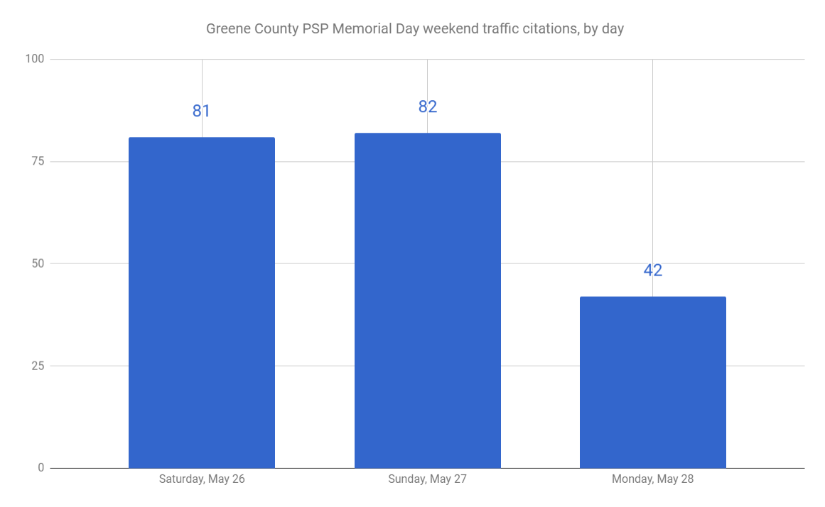 Traffic citations issued in Greene County by state police sorted by date over the Memorial Day weekend. These numbers do not include citations from municipal police.