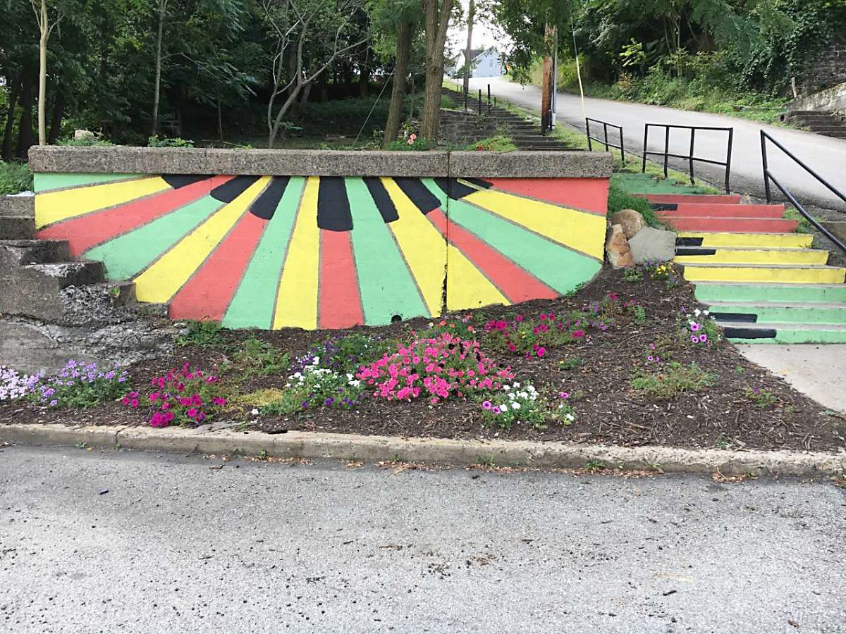 Students painted a mural of a piano with colored keys with permission of the owner of nearby Cast Iron Gallery.