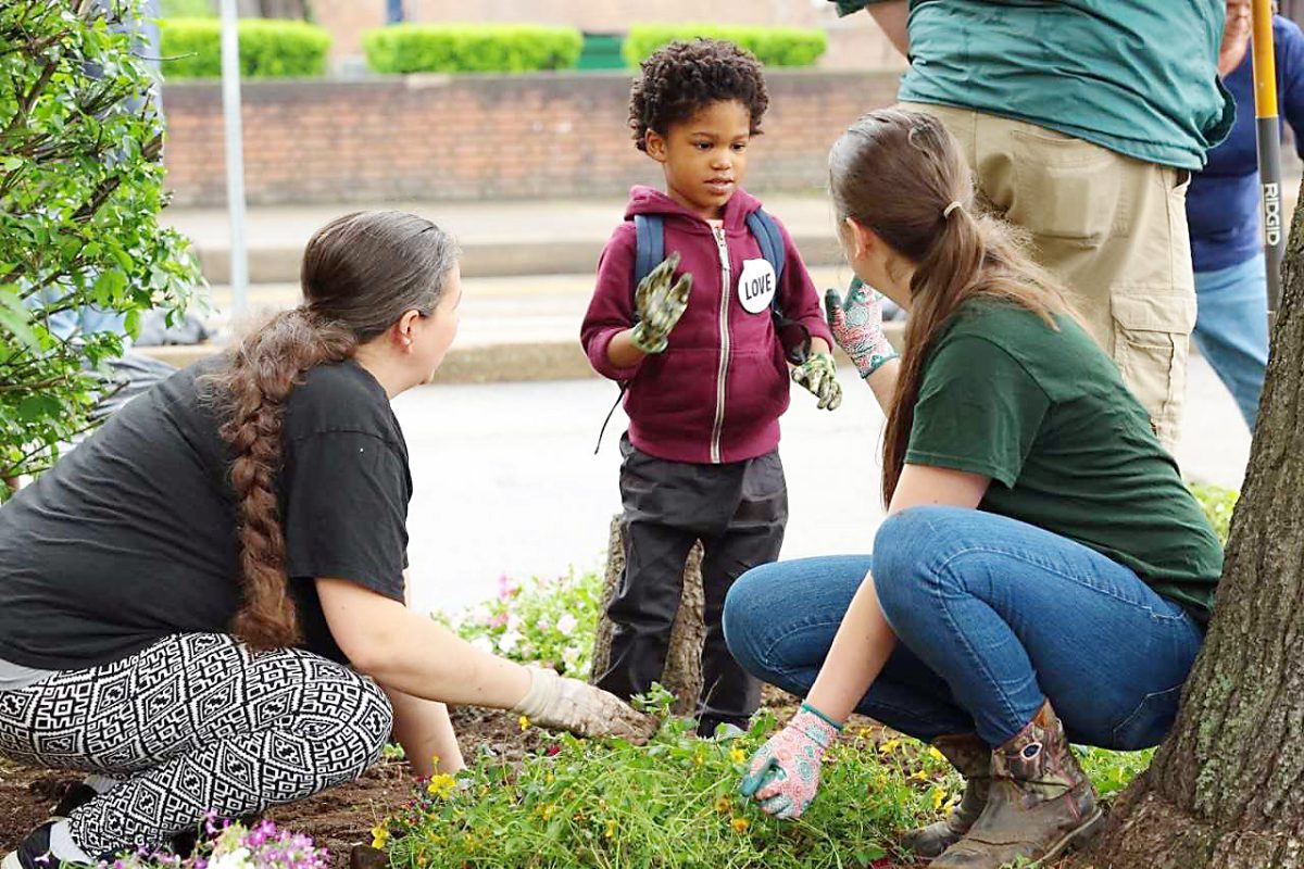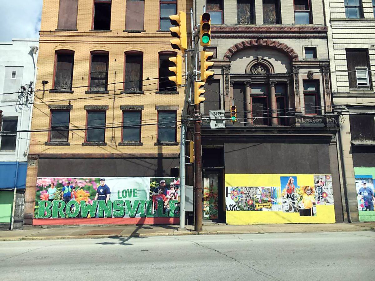Banners featuring photographs from cleanup and planting days hang on redevelopment authority-owned buildings with a reference to Love Brownsville, also made into a hashtag and represented on a large Google pin sculpture in Snowden Square.