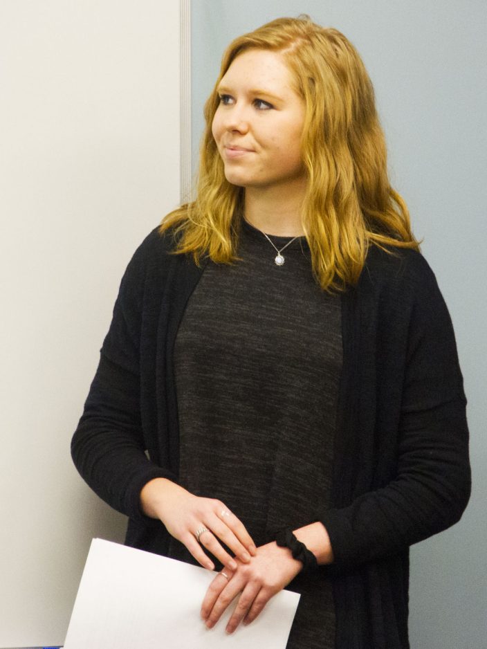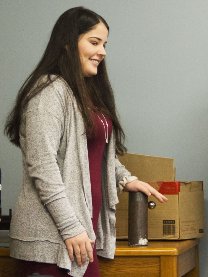 Peters Township High School student Natalie Glover discusses her group’s project: developing an inventory system for materials and parts used by fabricators in EAFab’s welding bays.