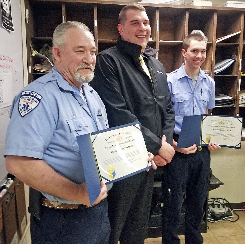 State police on Wednesday honored EMS Southwest medics Scott Ullom and Zachary McDowell with the department’s Outstanding Citizens Award recognizing them for putting their own lives in danger to save a West Virginia man following the Aug. 3 rollover crash on the interstate.