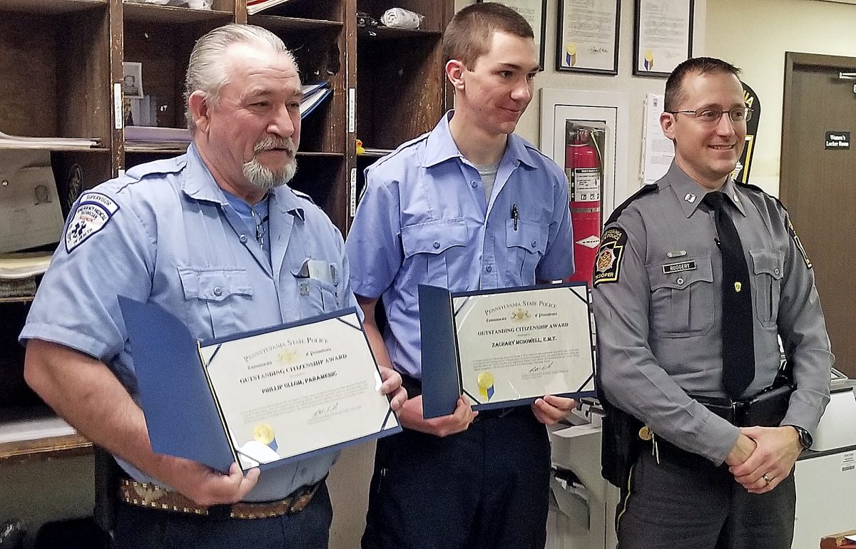 The request for the award was put through the state police’s chain of command and approved by department’s headquarters in Harrisburg. Ruggery acknowledged their “conspicuous bravery” during the ceremony Wednesday at the state police barracks near Wayensburg.