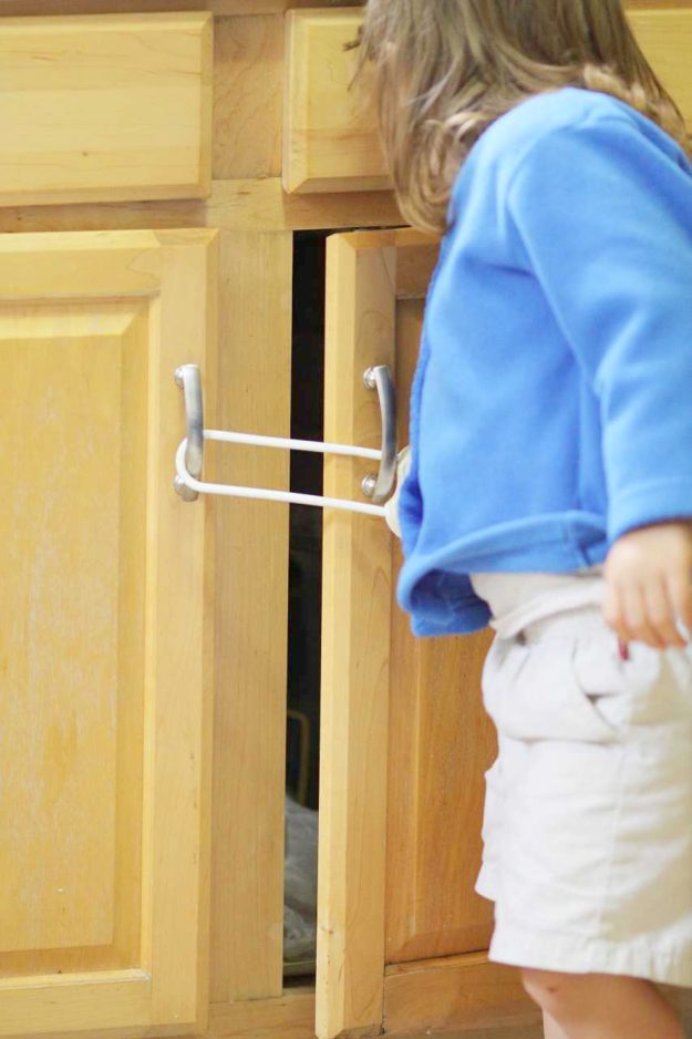 “We put safety latches on the drawers and doors – anything that opened, we basically latched shut,” she noted. “We had a toilet seat latch for a while. We had baby gates at the top of the steps, in the kitchen, the hallway. We had at least five.”