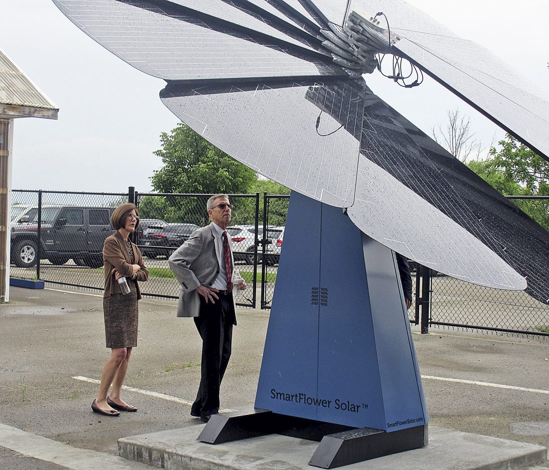 The state Department of Education’s executive deputy secretary, David Volkman, and Jean Dyszel, an education consultant for the state, check out solar flowers at Trinity Area High School during a Thursday tour.
