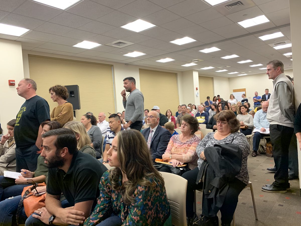 More than 100 parents and residents packed a town hall meeting at Frank Sarris Public Library, hosted by Crown Castle Communications, to voice concerns about the 33-foot-tall cell power booster.