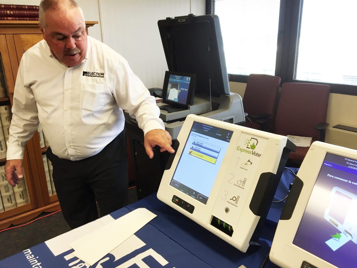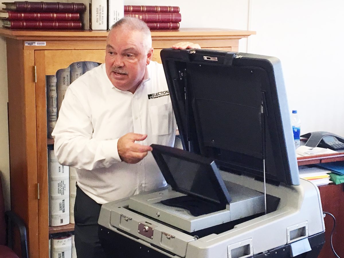 Election board Chairman William Knestrick requested a demonstration of the ES&S equipment from startup before voters arrive at a polling place, through the voting process, and how the machines are handled once the polls close.