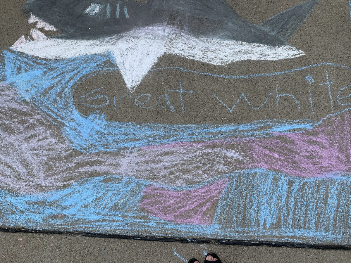 Little artists put chalk to the sidewalk in front of library, where they drew sharks, rainbows, self-portraits and positive messages.