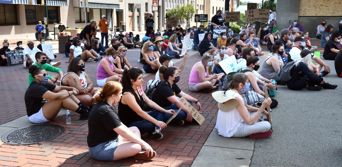 Protesters at the corner of Main and Beau Streets on the morning of June 6 pay tribute to the memory of George Floyd by sitting in silence for eight minutes and forty-six seconds, the length of time Floyd was reportedly forcibly restrained by Minneapolis police.