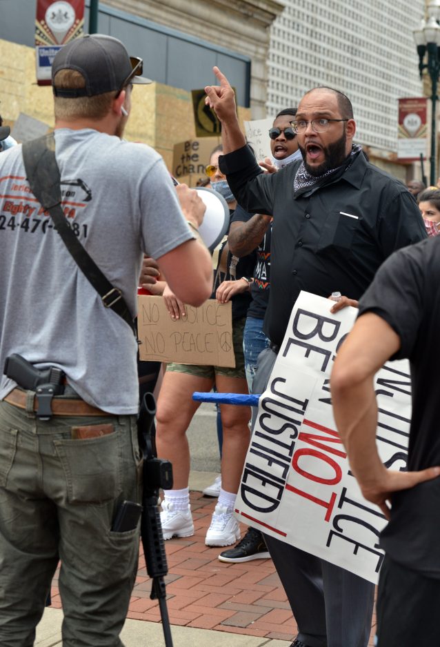 There were tense moments after about a half-dozen men showed up with assault rifles and handguns tucked in their waistbands. A speaker, Jo Jo Burgess of Washington, put his arm around one of the men with guns and drew him into the march.