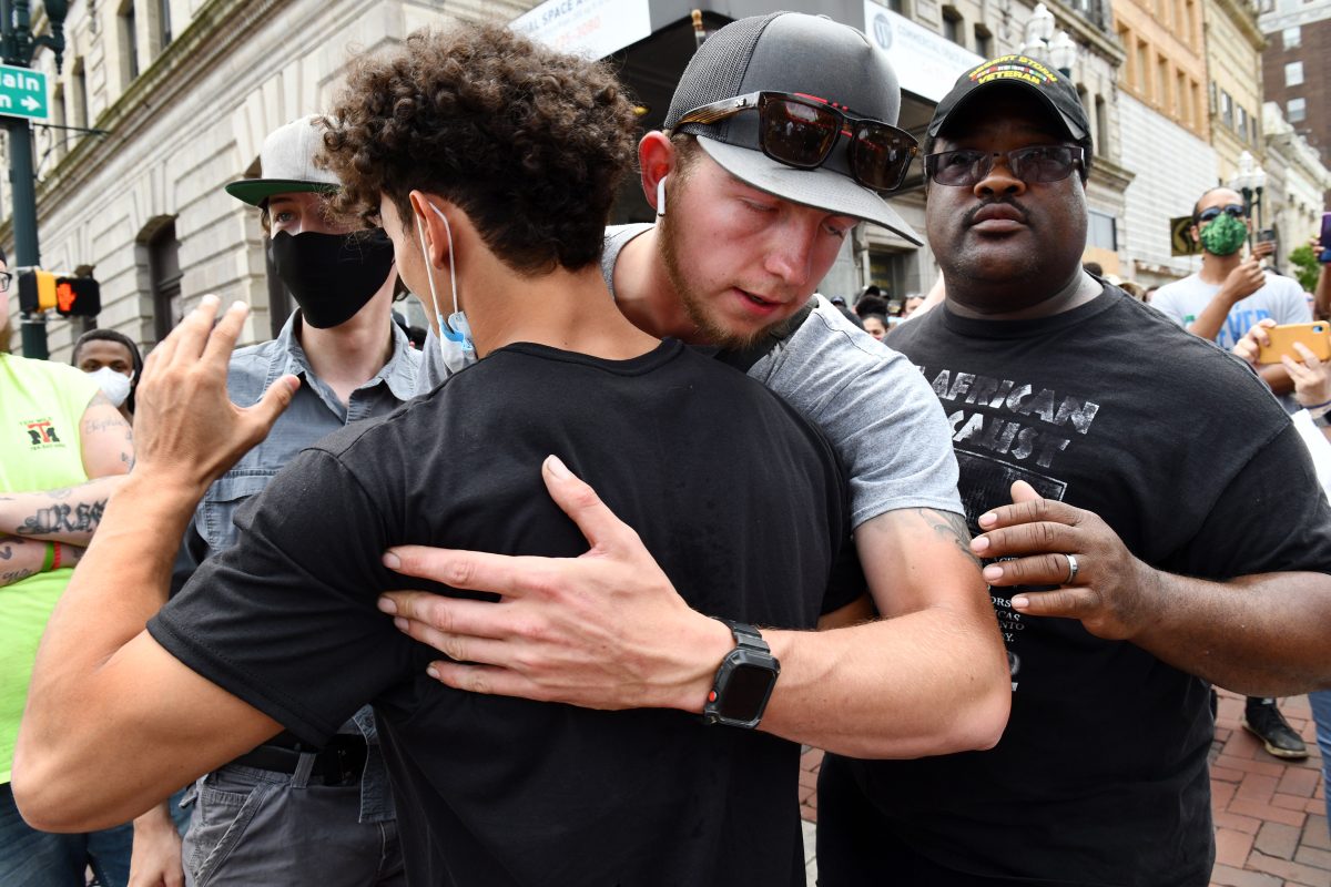 Protest leader Ahmad Morris Walker and Washington police Chief Bob Wilson share a moment of celebration as the marchers return peacefully to the county courthouse June 6.