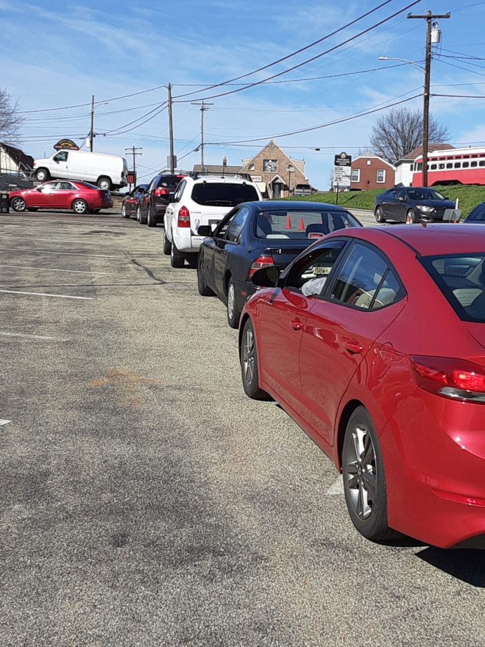 Vehicles queue up March 26 at the South Hills Interfaith Movement Center in Bethel Park for the distribution of donated Bethel Bakery bread.