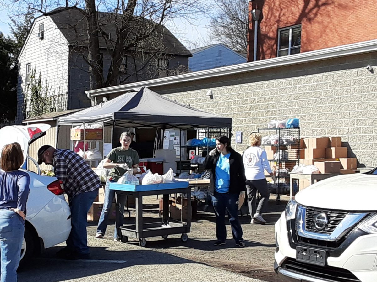 Volunteers help distribute bread March 26 at the South Hills Interfaith Movement Center in Bethel Park