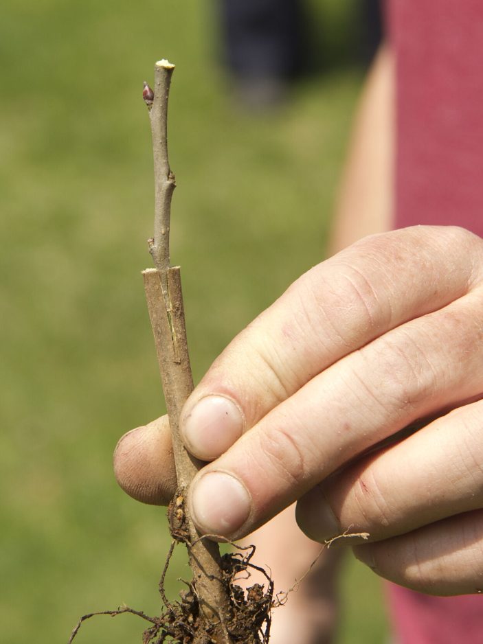 Chris Kubiak shows an example of a cleft graft, with a piece of the Gilfillan Farm apple tree placed in the middle of the rootstick limb.