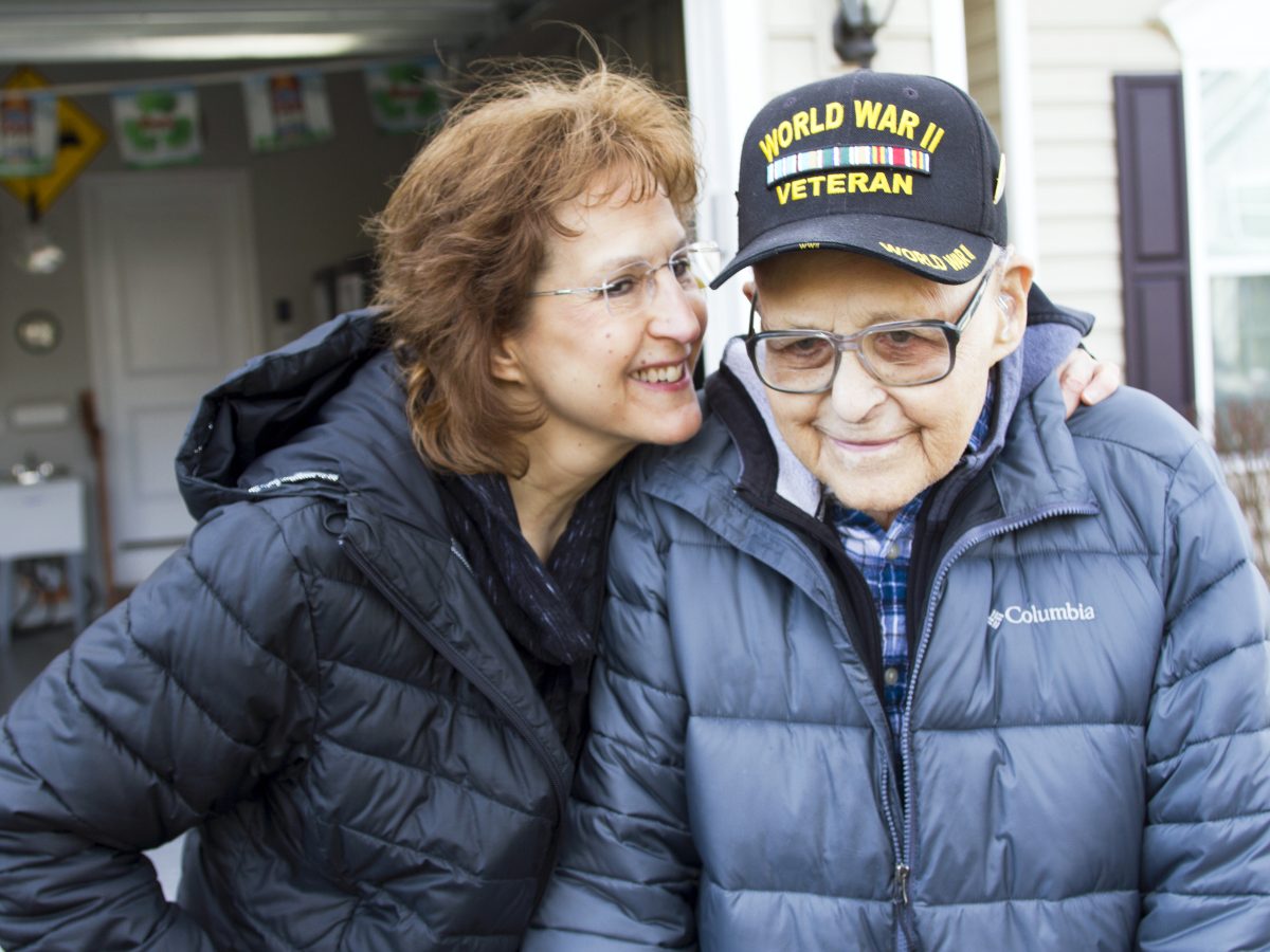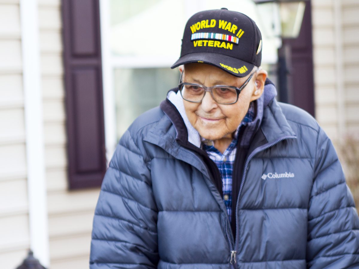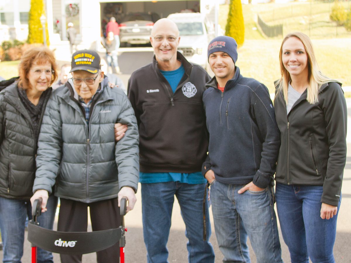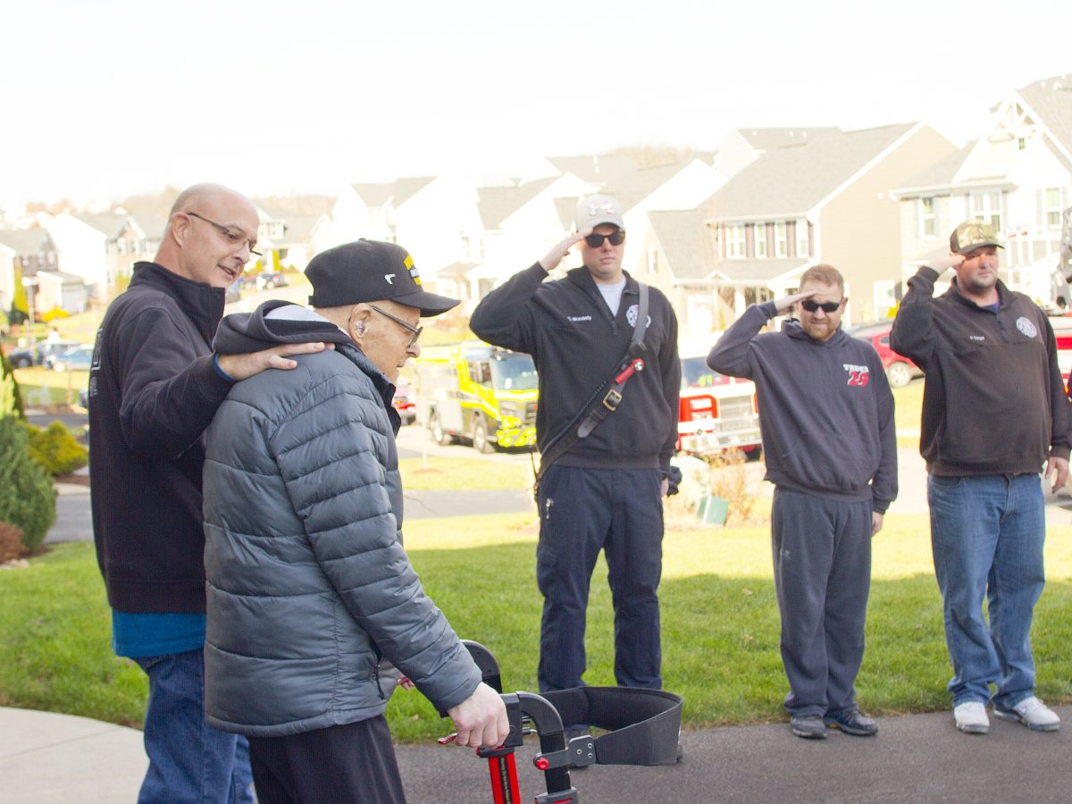 To help celebrate his 104th birthday, several fire engines lined his street. And flying from the ladder of Muse Fire Department’s Truck 29 was a grand U.S. flag, honoring his service in the U.S. Army Air Corps during World War II.