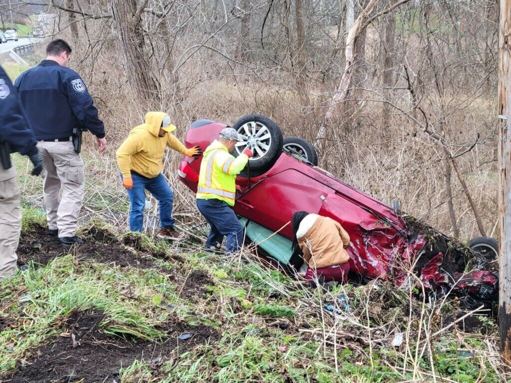 North Strabane firefighters had to remove the doors of the car to free the driver of the overturned passenger vehicle. The woman was placed on a stretcher and later flown by medical helicopter to a Pittsburgh hospital for treatment. The severity of her injuries was not immediately known, but she was conscious at the scene.