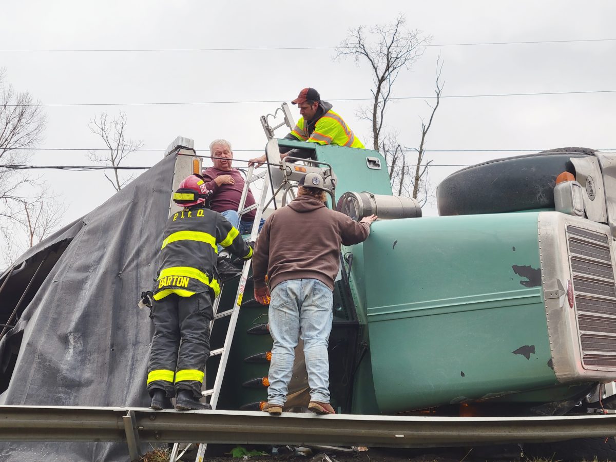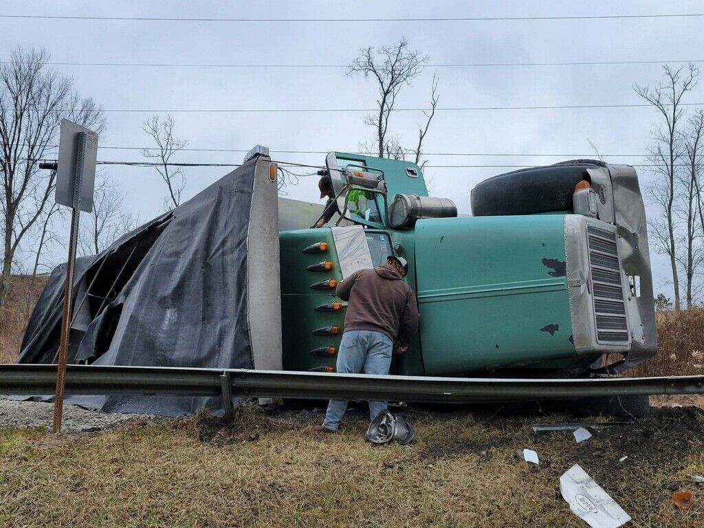 Firefighters were able to help the driver of the tri-axle get out of his truck by placing ladders toward the top of the cab for him to climb down. He complained of a leg injury, but appeared to be otherwise fine.