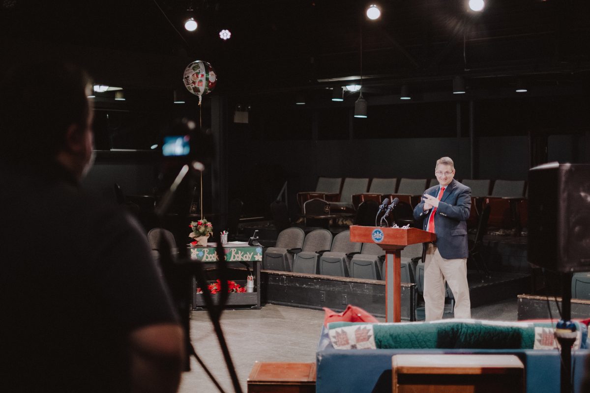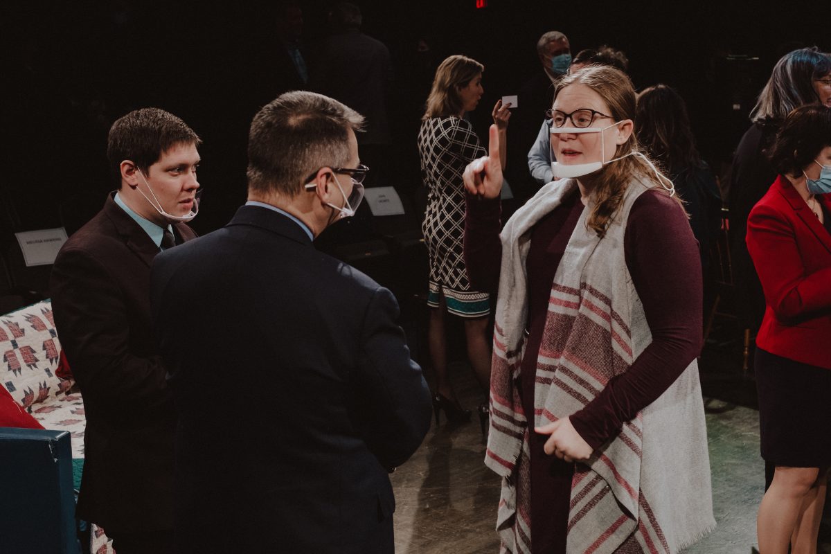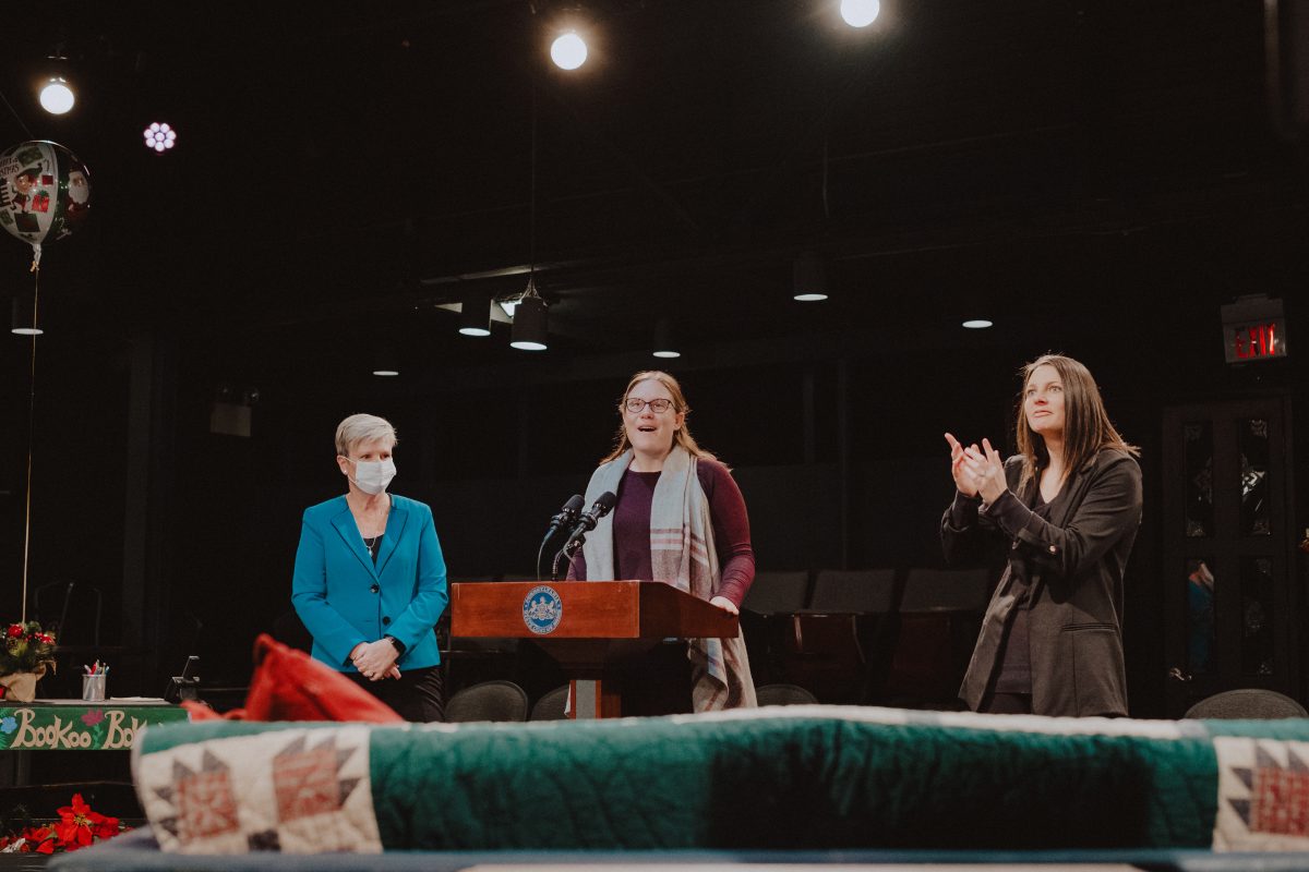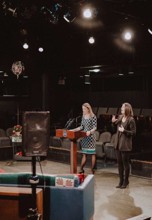 Jena Oberg, center, artistic director for Little Lake Theatre, spoke at Friday morning’s news conference. Oberg, whose six-year-old daughter, Anusha Oberg, is deaf, said past initiatives have made the arts more accessible for the seeing impaired, but noted the community falls short on bringing the arts to the hearing impaired. “We cannot wait to see where this partnership will go,” said Oberg.