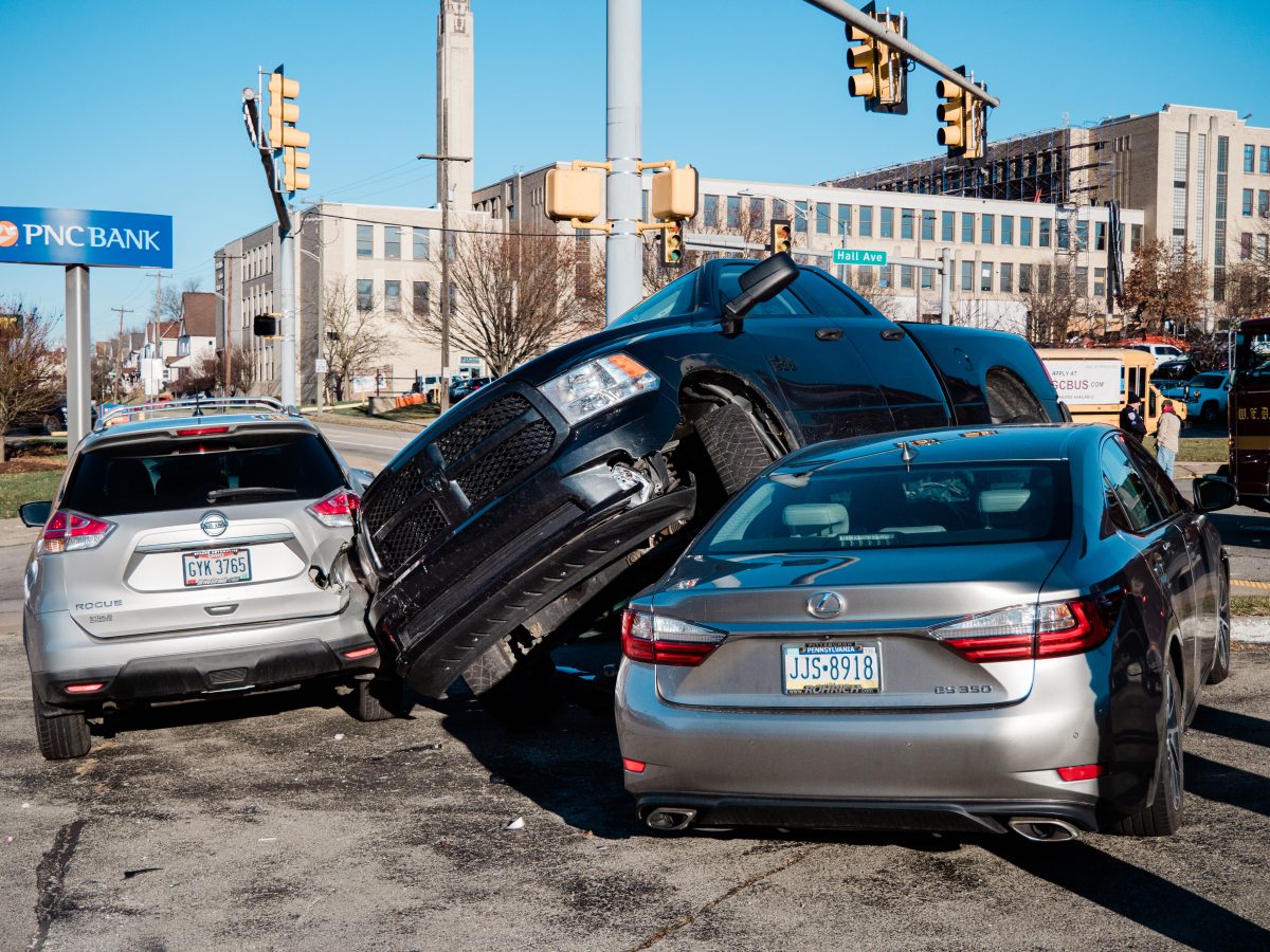 A pickup truck damaged two parked vehicles following a two-vehicle accident at Jefferson and Hall avenues about 9:15 a.m. Monday in Washington. The truck went over a curb and landed on top of two vehicles parked in the Washington Post Office parking lot. The vehicles belonged to mail carriers. The woman driving the pickup truck was taken to Washington Hospital for evaluation, but did not appear to be seriously injured, according to the Washington Fire Department. The other vehicle was stopped in the middle of the intersection.