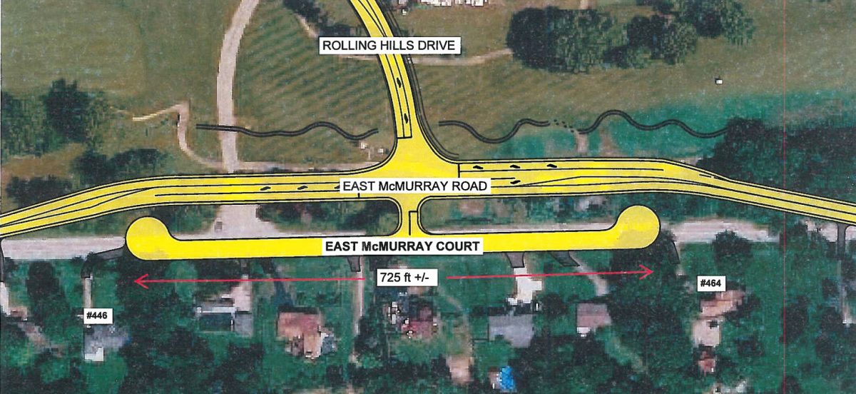 East McMurray Road has been reconfigured to bend slightly to the north, in conjunction with the construction of the new Peters Township High School and Rolling Hills Park. As a result, nine residences no longer have direct driveway access to the new portion of the street.