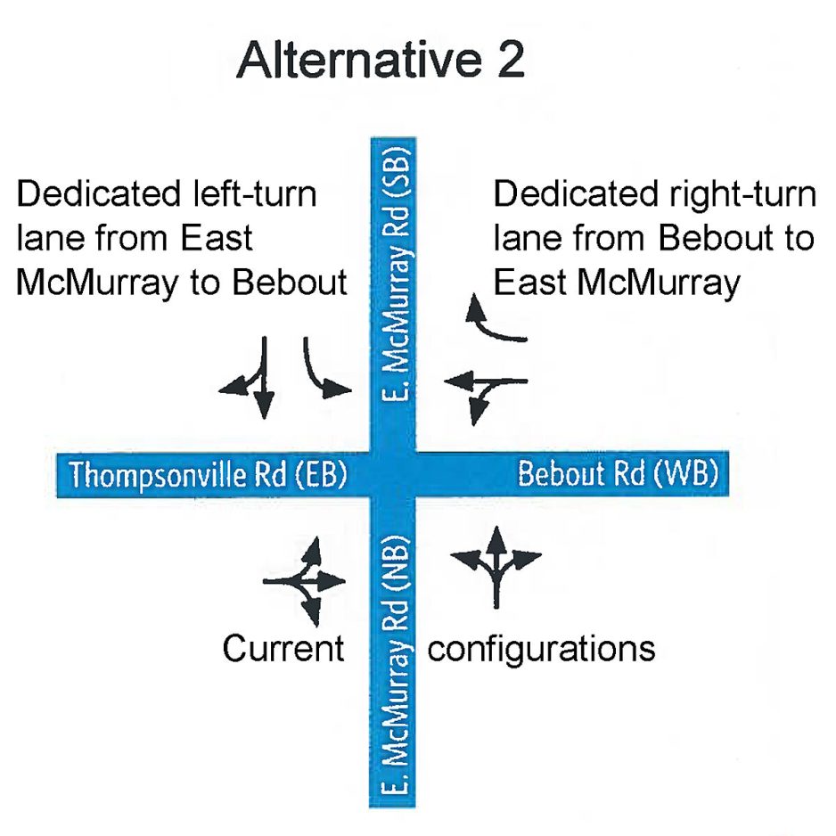 Donnan’s preference is for the alternative that adds turning lanes in all directions, plus a third lane at Bebout’s approach. Plus he proposes limiting access to and from Thompsonville for a gas station-convenience store at the intersection.