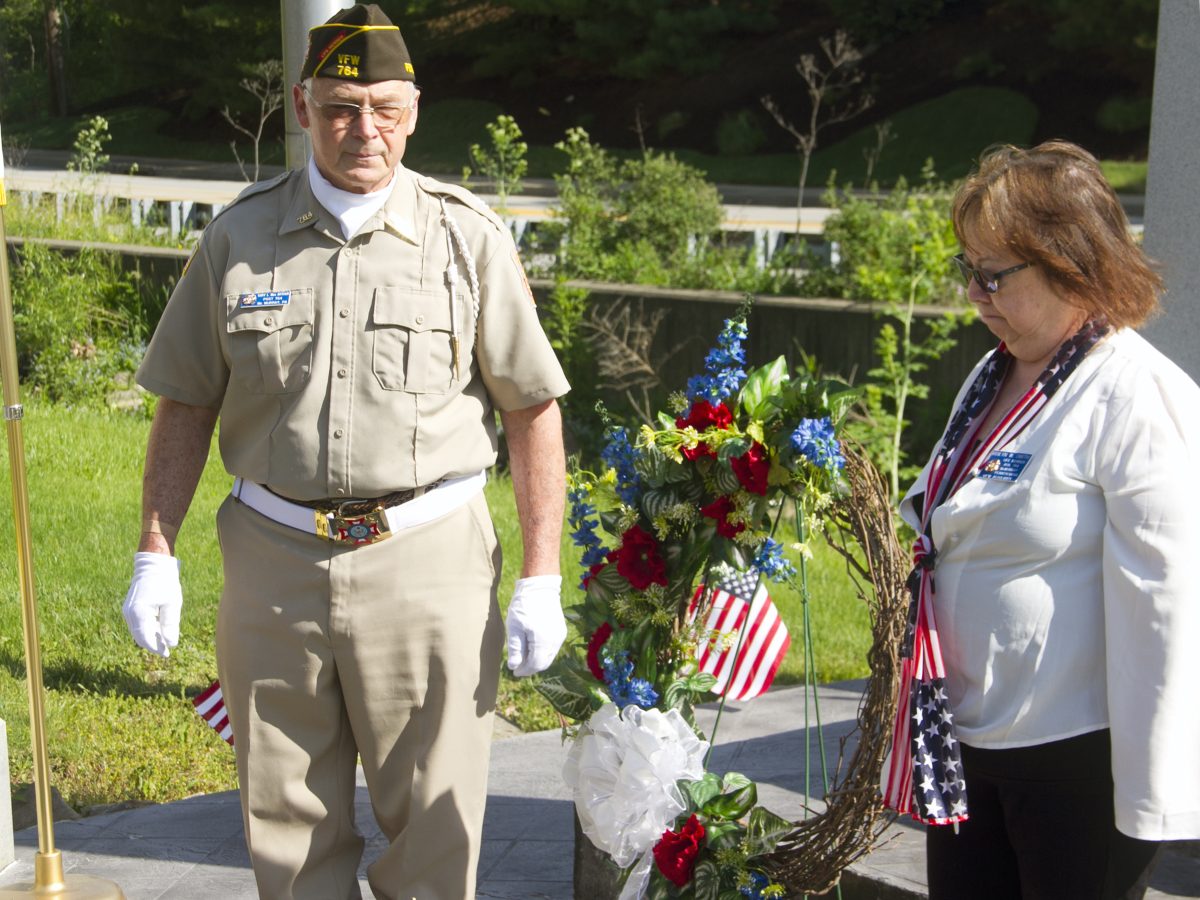 Gary MacArthur and Robyn Smith place a memorial wreath during the observance.