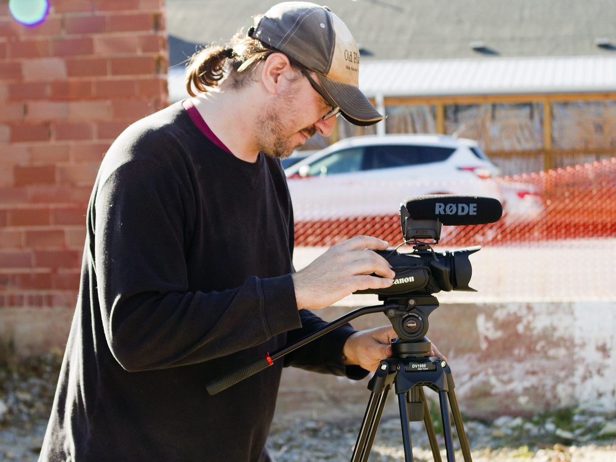 Clay Kilgore sets up a camera to record “Laid Back History.”