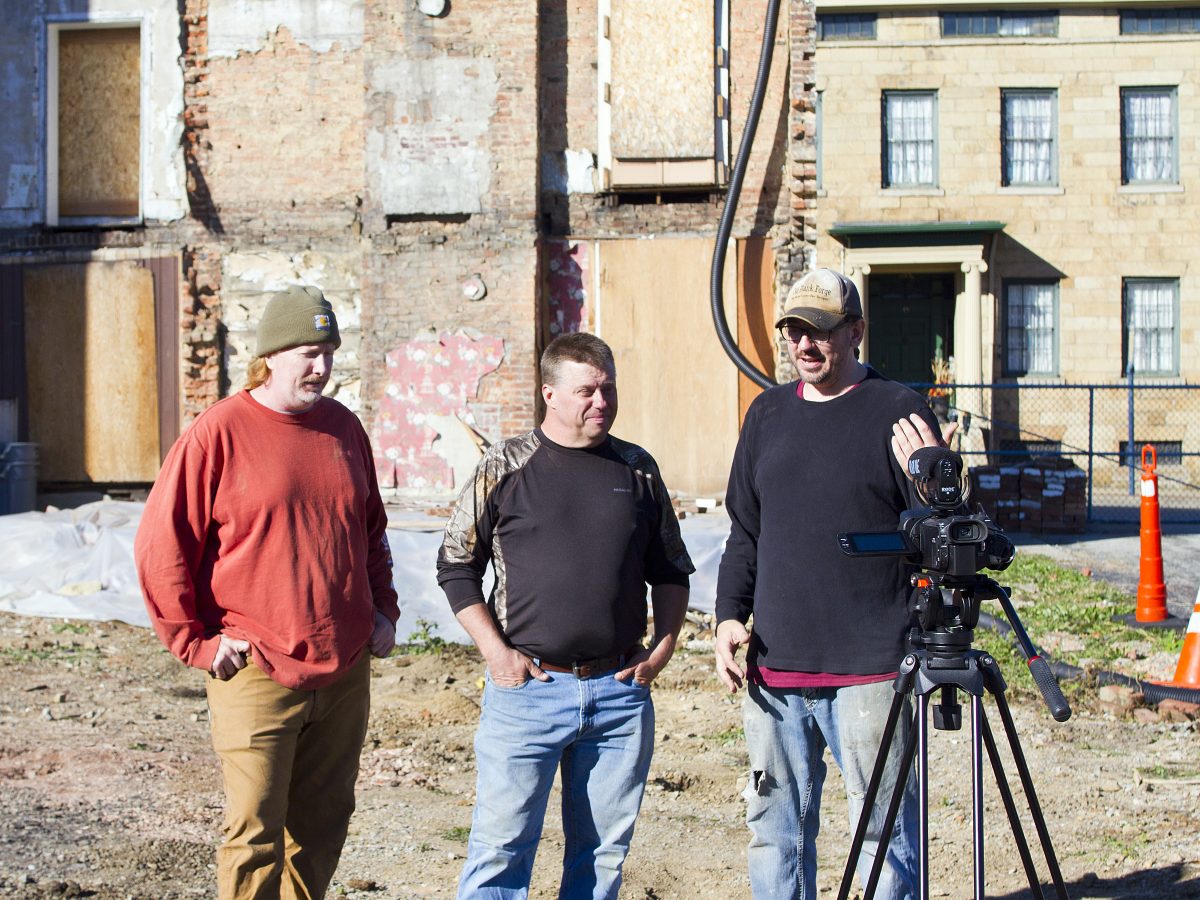 From left, Bryan Cunning, Rich Baker and Clay Kilgore film the latest episode of “Laid Back History” in back of the home of Dr. John Julius LeMoyne beginning in 1826. At right, across East Maiden Street, is the LeMoyne House, headquarters of the Washington County Historical Society.