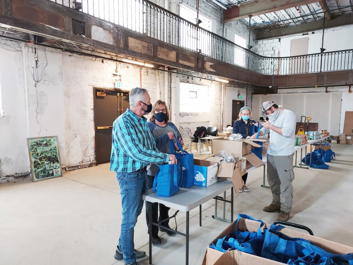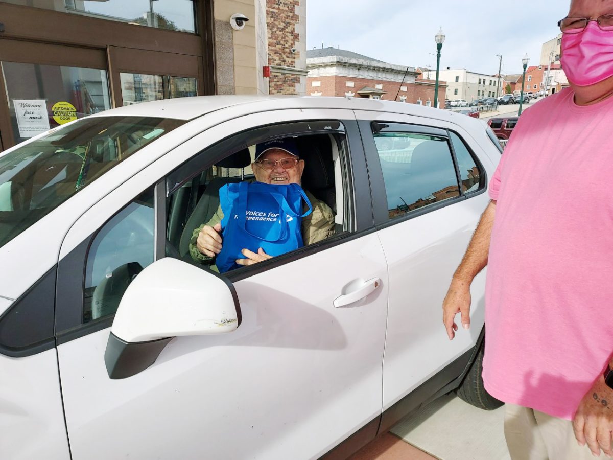 TRPIL/Voices for Independence held a Thanksgiving drive-thru Thursday. John Moore, staff member, is shown with David Iams of Washington receiving his fixings for a Thanksgiving dinner. A reusable mug was included, along with cranberries, green beans, corn, boxed stuffing, gravy, boxed mashed potatoes, turkey breast and homemade pumpkin roll. Recipes were included in the bag. This is the second year TRPIL has provided the service. The organization hopes that next year’s event will be held in person at its new facility at 42 W. Maiden St., Washington. FirstEnergy staff members volunteered their time to pack the bags for the drive-thru. From left are Mark Dorazio, Jane Henderson, Jacob Fisher and Makinley Higginbotham. Randy Durr, manager of regional external relations, presented a $5,000 check to the organization from the FirstEnergy Foundation.
