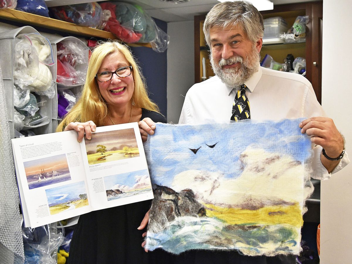 Fiber artist Judé Ernest, who will be part of the Mt. Lebanon Artists’ Market, enjoys teaching the medium. The Almanac’s own Harry Funk shows a piece that he and his wife, Tammy, completed in 2019.