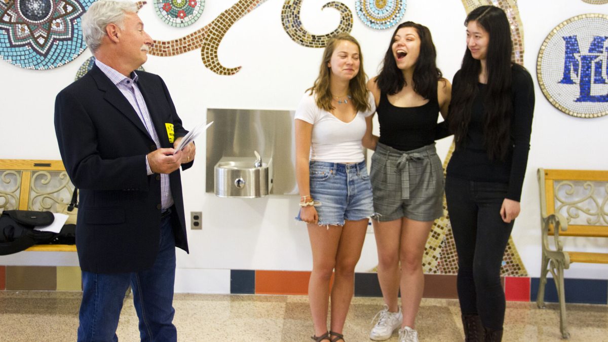 From left, Steve Denenberg surprises then-Mt. Lebanon High School students Paulina Braverman, Alyssa Scott and Hannah Wu by announcing they all have been selected for the 2018 Mt. Lebanon Partnership Arts Initiative Scholarship, instead of just one of them.