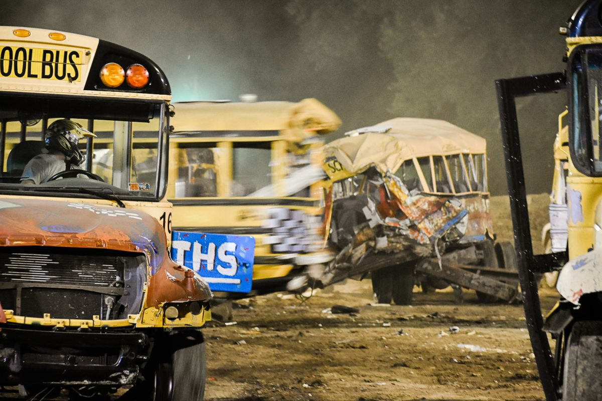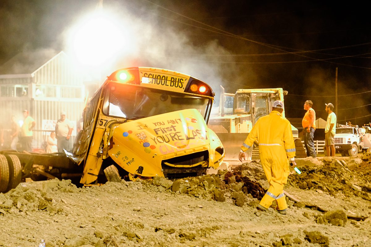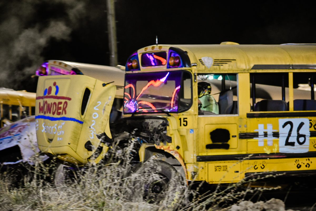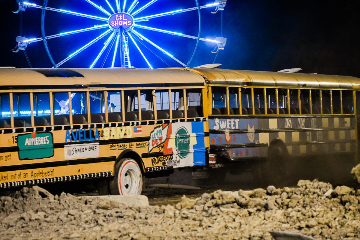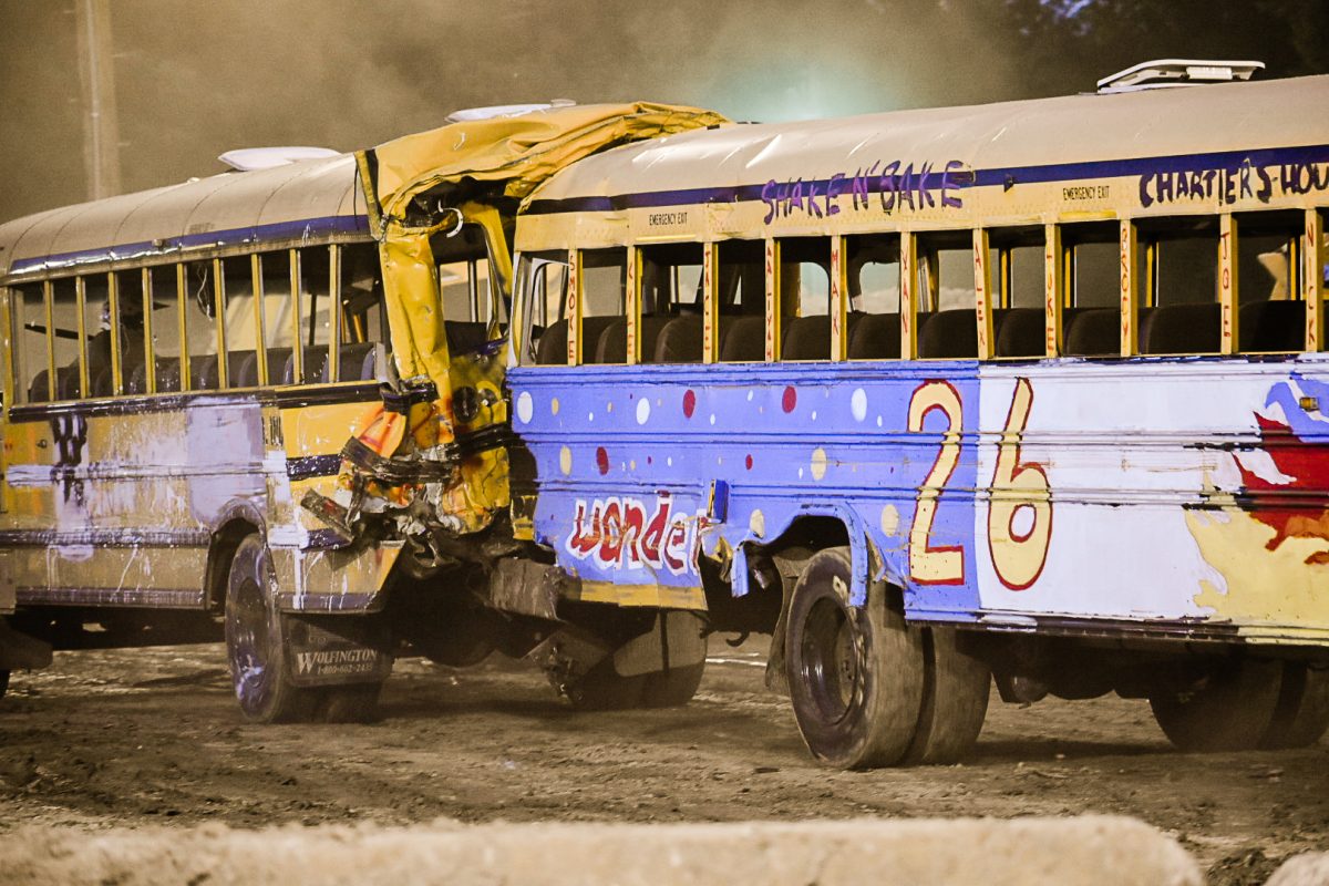 Crowds remained enthralled by the derby from sunset to dark, erupting in applause when buses teetered on their sides or doors fell off their hinges. The school bus demolition derby is one of the biggest event attractions, Hunnell said, and Wednesday marked the fair’s largest attendance as of press time Thursday.