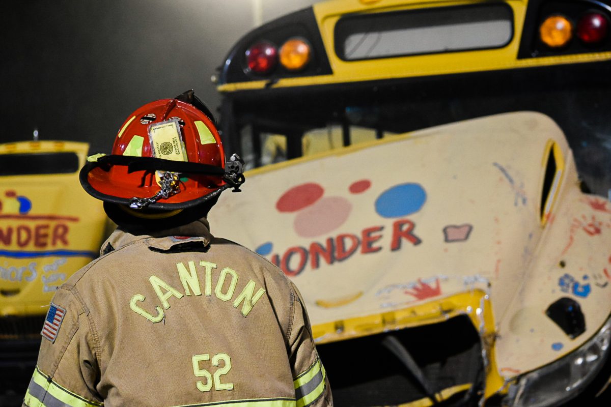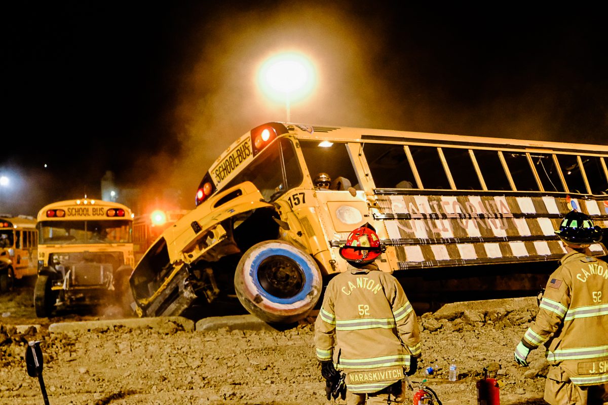 A Canton Township firefighter watches as a school bus careens over the wall during the demolition derby Wednesday evening. The Chartiers fire department, Canonsburg EMS and Allegheny Health Network EMS were also on site.