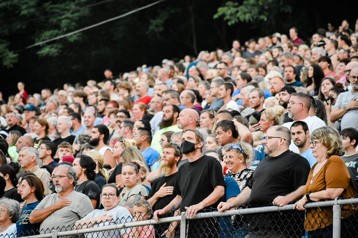 The school bus demolition derby stands for the national anthem Wednesday evening. An estimated 8,000 people gathered to watch the annual derby show.
