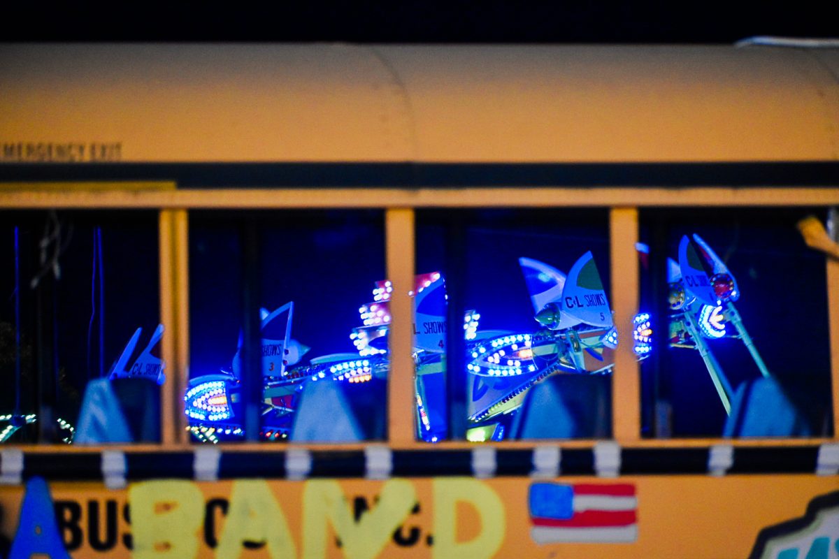 Lights from a carnival ride glow through the windows of Avella's bus during the annual school bus demolition derby.