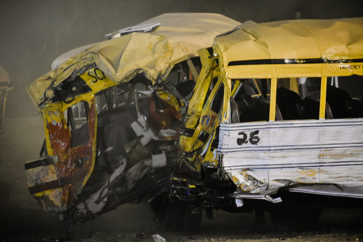 As the Avella school bus takes a hit, the windshield breaks and falls forward, out of place. Doors and bumpers also flew through the air during the school bus demolition derby.
