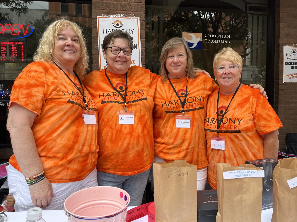 The women, clad in orange Harmony Life Center T-shirts, manned a table that featured raffle items and information about Harmony Life Center.