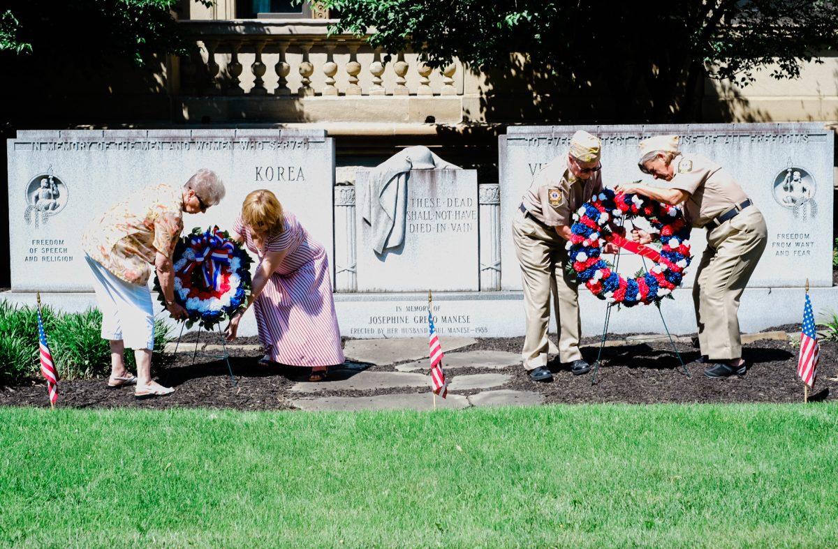 From the cemetery, Post 175 and a small crowd caravanned to the Washington County Courthouse, where post commander Ken Randolph presided over a solemn wreath-laying by members of the legion and of VFW Post 972. A second gun salute rang through downtown’s empty streets.