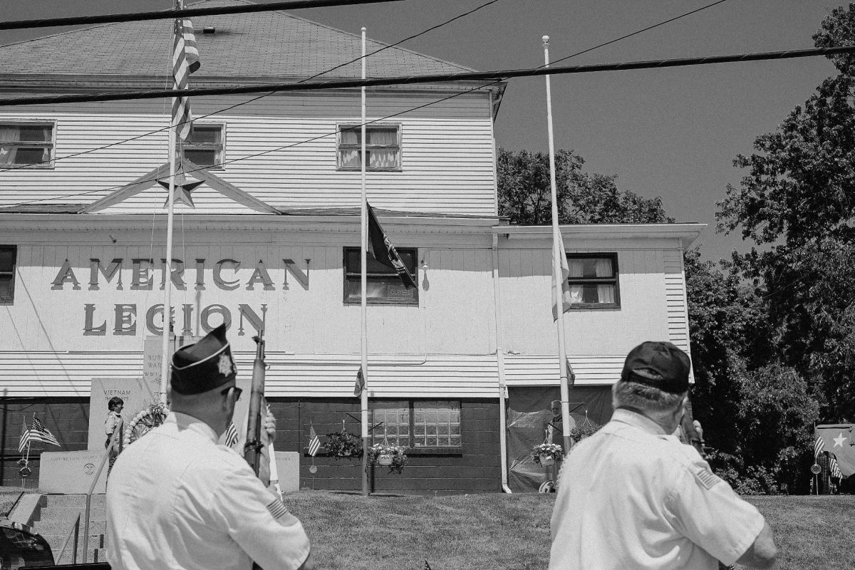 Following a wreath laying, the Slovan VFW performs a gun salute outside the Burgettstown American Legion. The service concluded a morning of Memorial Day ceremonies throughout the area.