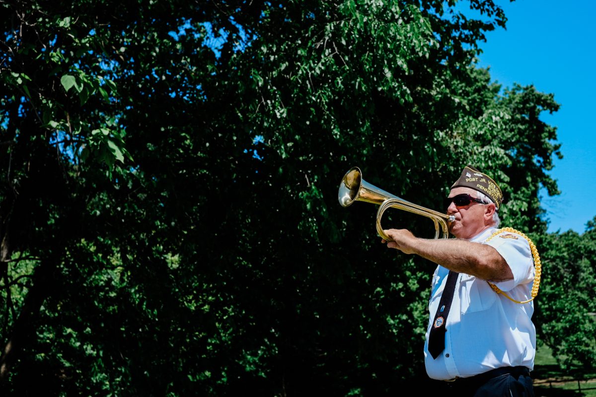 William Gavazzi, junior vice president of Slovan Veterans of Foreign Wars, plays the military Taps following a 21 gun salute outside the Burgettstown American Legion Monday morning. A small crowd stood, hands over hearts, as Gavazzi’s song carried on a hot summer breeze.